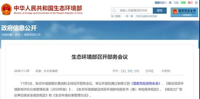 11月5日,生態(tài)環(huán)境部部長黃潤秋主持召開部務(wù)會議,審議并原則通過制修訂的《國家危險廢物名錄》、《建設(shè)項目環(huán)境影響評價分類管理名錄(2020年版)》、《生態(tài)環(huán)境部建設(shè)項目環(huán)境影響報告書(表)審批程序規(guī)定》、《核動力廠營運單位核安全報告規(guī)定》和《生態(tài)環(huán)境標(biāo)準(zhǔn)管理辦法》。