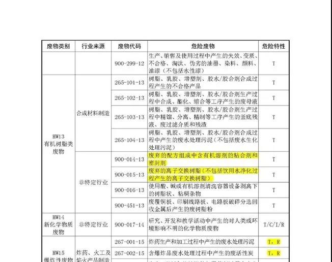 7.明確部分類別廢物的涵蓋范圍。2016 年版《名錄》中對樹脂、乳膠、增塑劑生產(chǎn)過程中產(chǎn)生的危險廢物的界定不清晰,導(dǎo)致涵蓋范圍過大。實際調(diào)研發(fā)現(xiàn)不同來源的上述廢物危險特性存在較大的差異。根據(jù)危險特性調(diào)查結(jié)果,本次修訂將其中危險特性較小、環(huán)境風(fēng)險可控的廢物從《名錄》中刪除。