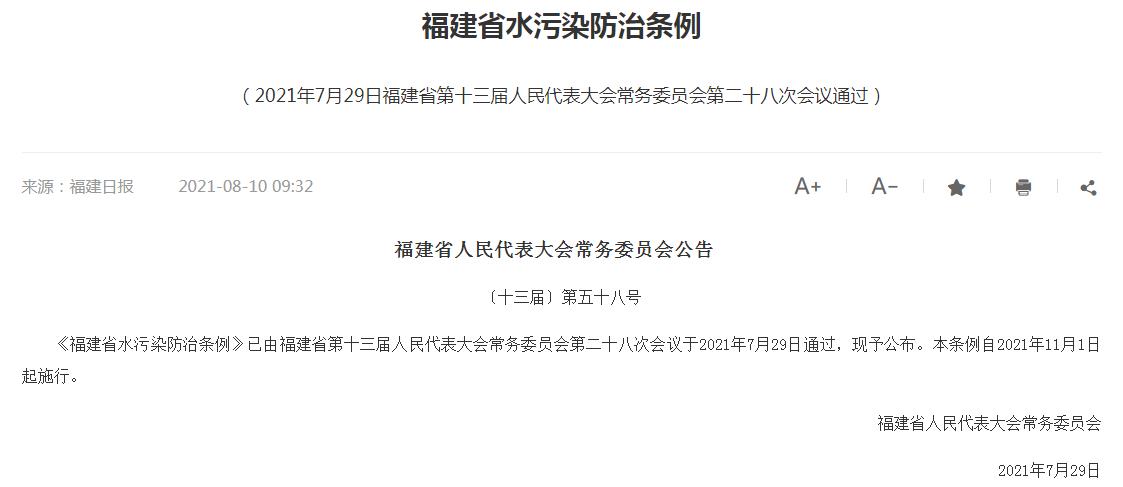 第七十條 本條例自2021年11月1日起施行。2011年12月2日福建省第十一屆人民代表大會(huì)常務(wù)委員會(huì)第二十七次會(huì)議通過(guò)的《福建省流域水環(huán)境保護(hù)條例》同時(shí)廢止。