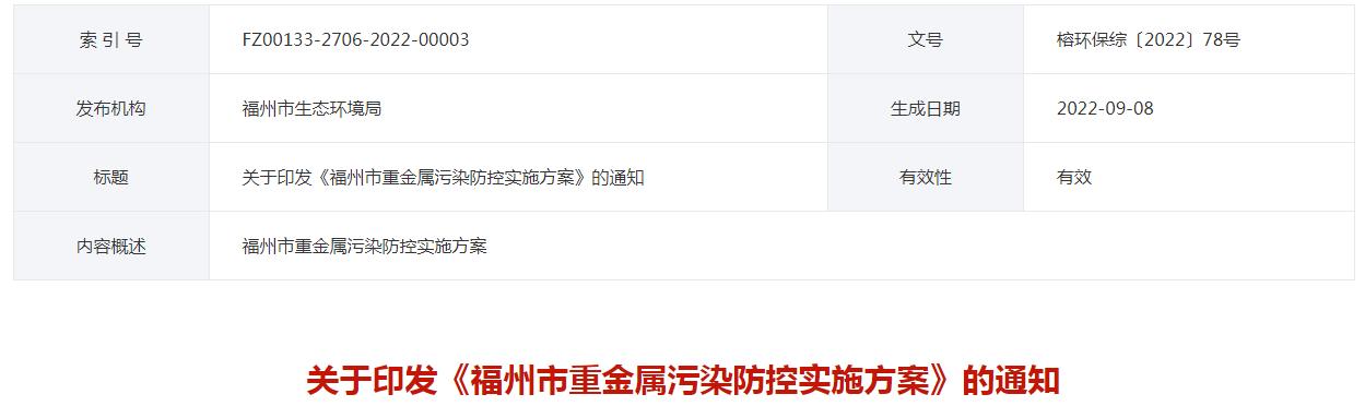 福州市生態(tài)環(huán)境局發(fā)布重金屬污染防控實施方案